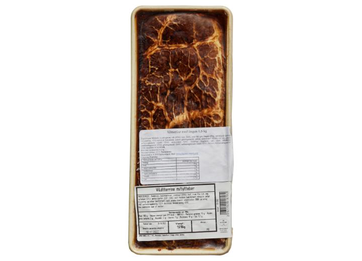 | svinekød, fjerkrælever, vildtkød (hjort) (20 %), svinefedt, svær fra svin, ÆG, tyttebær (2,5%), ribsgelé (glukose-fruktosesirup, ribssaft fra koncentrat 35%, sukker, geleringsmiddel: pektin, surhedsregulerende middel: citronsyre E330), hvidvin (SULFITTER), peber. Overflade: fedtnet af svin, svinegelatine, salt, eddike, aromaer, karamelliseret sukker, farve: karamel. Oprindelse: svinekød: Frankrig, vildtkød: EU | |